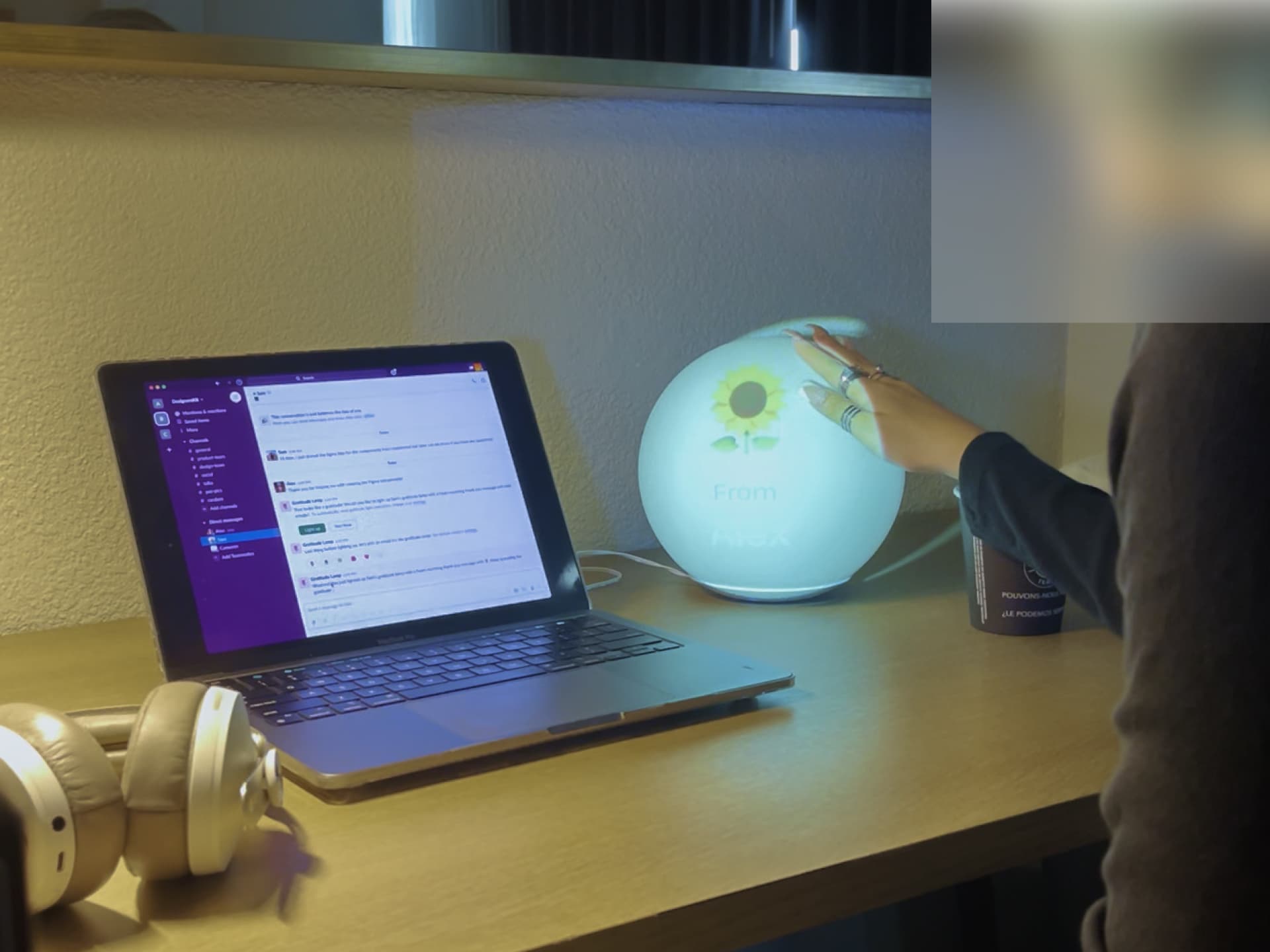 We wanted to enhance the sense of appreciation carried in text messages by giving it a more tangible form, which is manifested through the orb that is connected to the user’s work communication platform, such as Slack. We chose the medium of light and sound to indicate an incoming appreciation message.